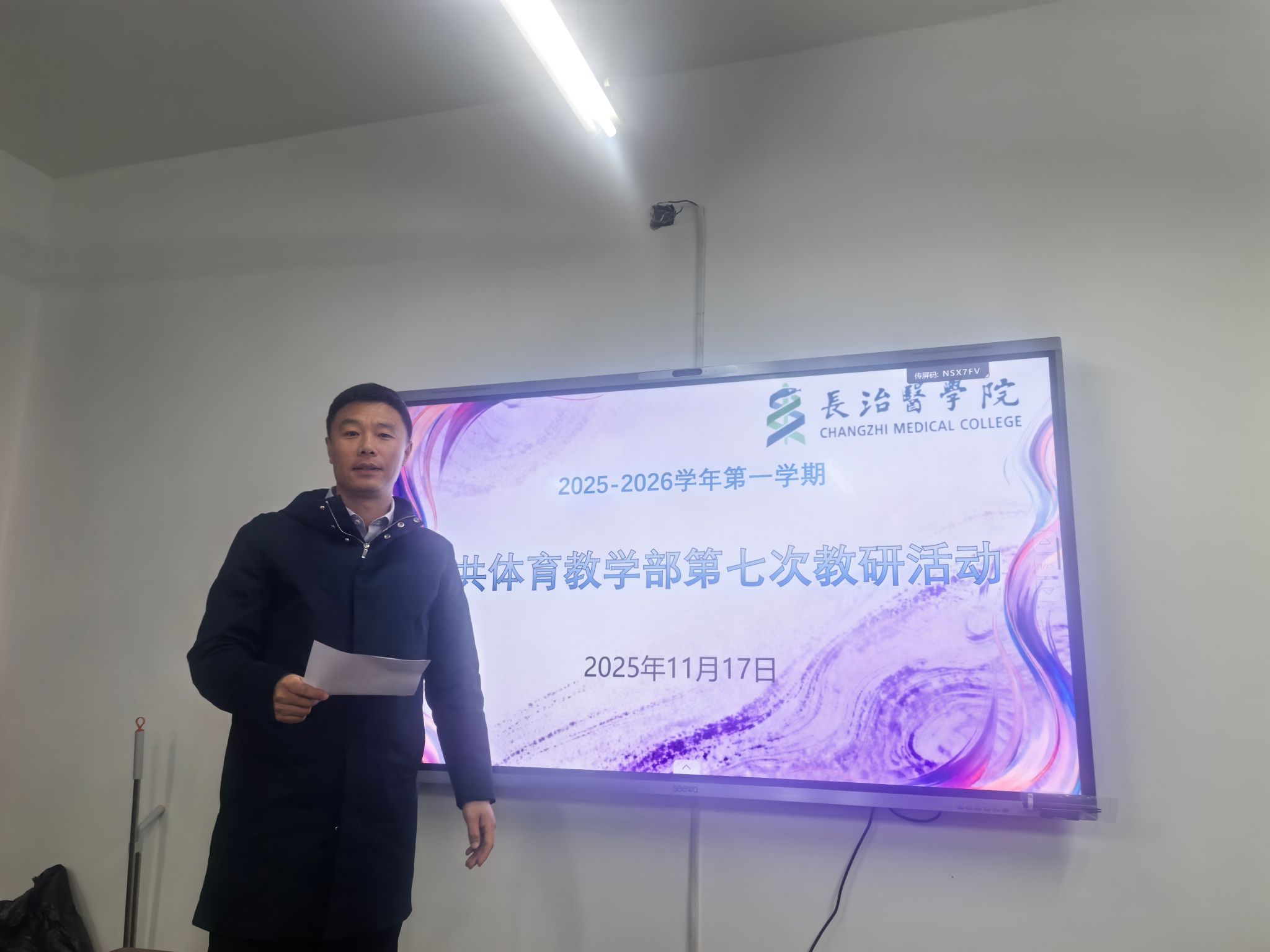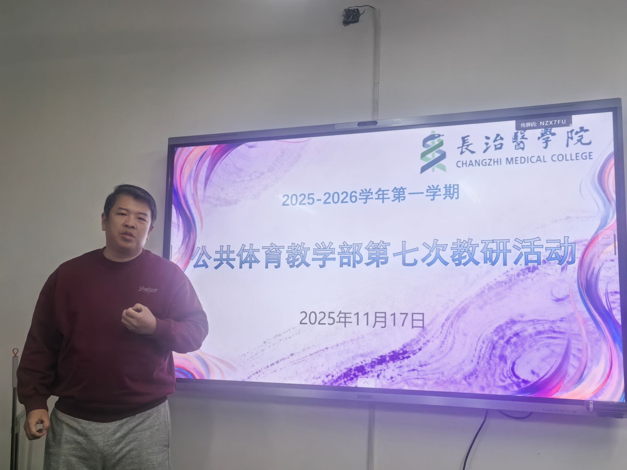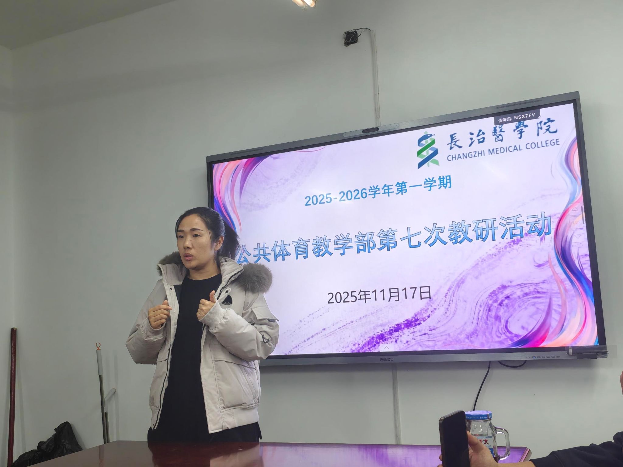 2025年11月17日下午,长治医学院公共体育教学部全体教师于部门会议室召开本学期第七次教研活动,核心主题为“公共体育教学部第二次集体磨课”。本次活动由张琦、王志方、安强、杨子轩、佟伟、杨潞然、郝小飞、赵岩八位教师牵头,围绕跳绳、足球、健美操、乒乓球、跆拳道、形体训练、体适能七门课程展开磨课分享与研讨,旨在通过“课程聚焦+集体献策”优化教学细节,强化课堂实效,为公共体育课程质量提升夯实基础。