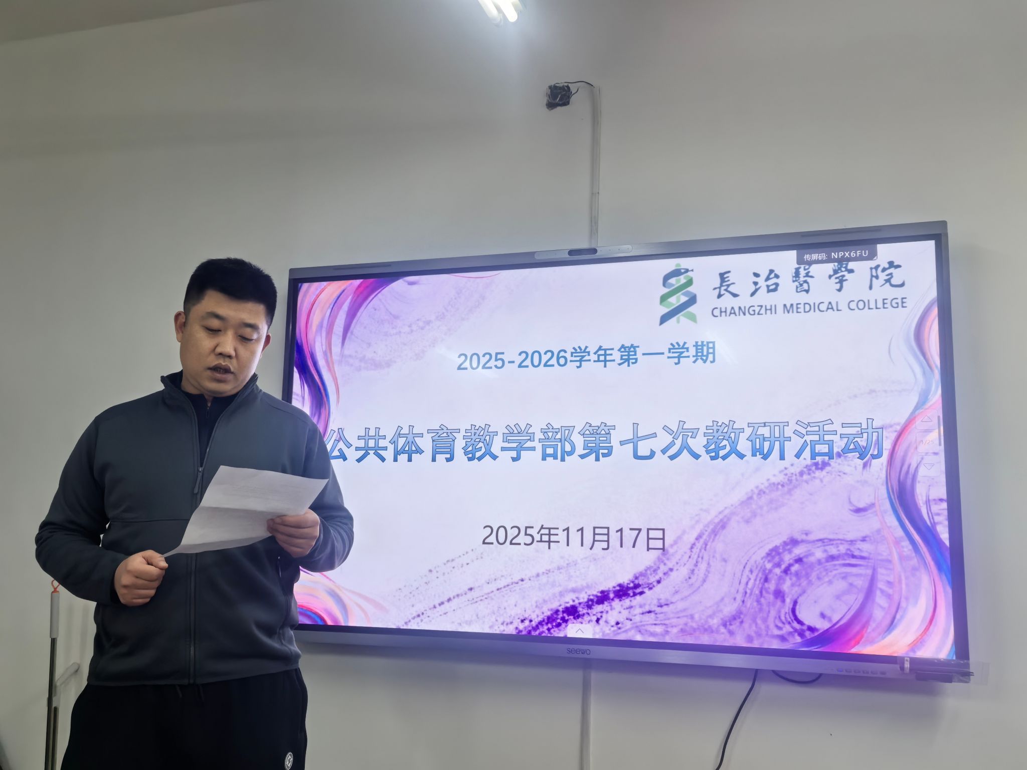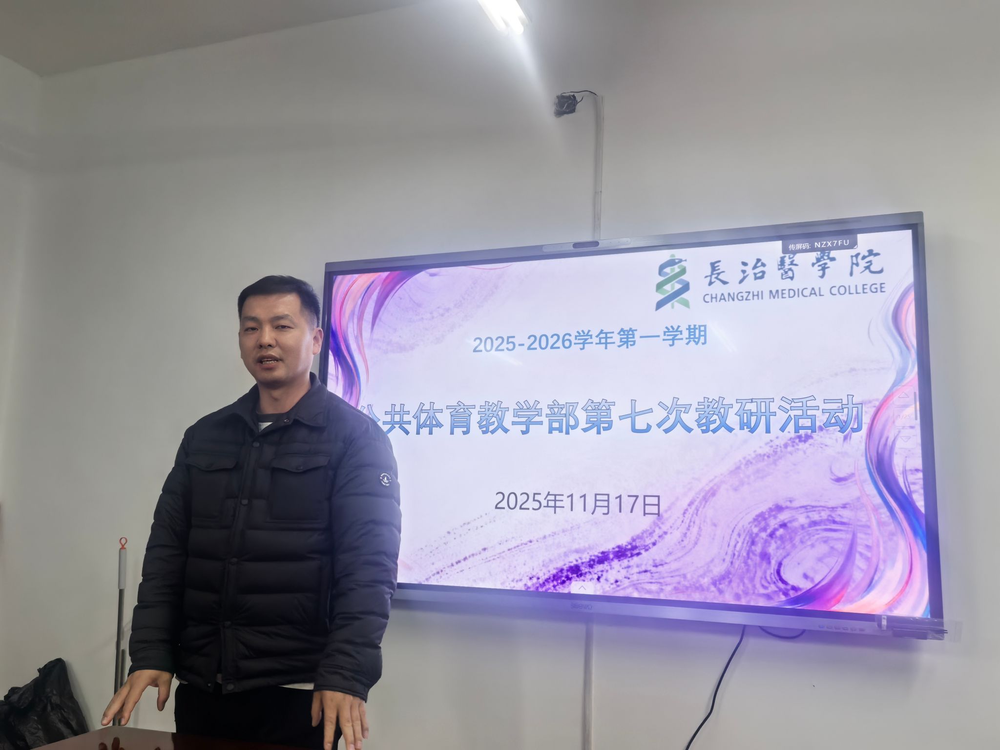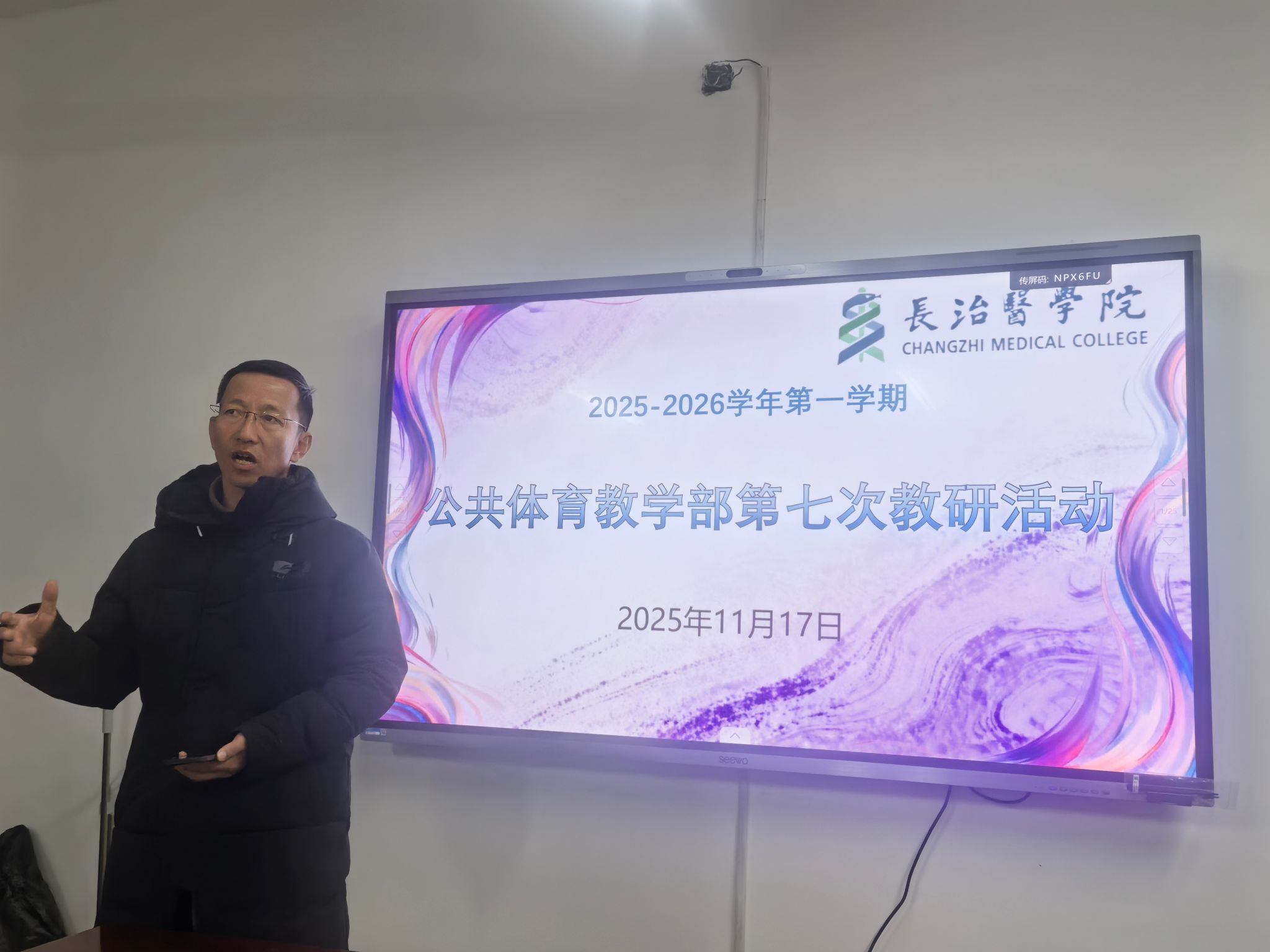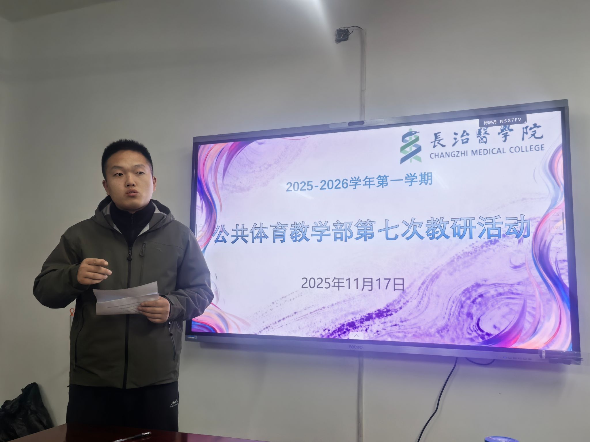 2025年11月17日下午,长治医学院公共体育教学部全体教师于部门会议室召开本学期第七次教研活动,核心主题为“公共体育教学部第二次集体磨课”。本次活动由张琦、王志方、安强、杨子轩、佟伟、杨潞然、郝小飞、赵岩八位教师牵头,围绕跳绳、足球、健美操、乒乓球、跆拳道、形体训练、体适能七门课程展开磨课分享与研讨,旨在通过“课程聚焦+集体献策”优化教学细节,强化课堂实效,为公共体育课程质量提升夯实基础。